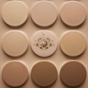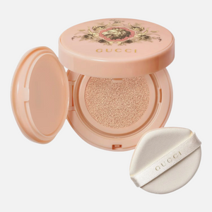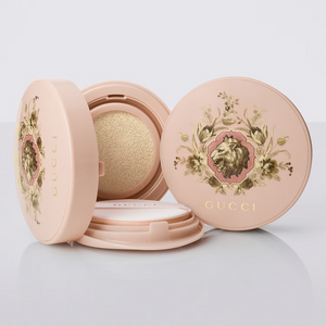 Available in twelve foundation shades that provide intense hydration that lasts all day, Cushion De Beauté skin-caring foundation by Gucci Beauty is housed within a refillable pastel pink compact, complete with a mirror and a soft cushion applicator and embellished with a lion motif encircled by a wreath of flowers. The external packaging echoes this delightful design, adding an extra touch of allure and playfulness.